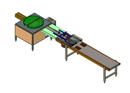 Uređaj koji služi za dijeljenje 300 komada tortica u dva smjera s naslagivanjem tri tortice u stupac te transportiranjem naslaganih tortica do pozicij...