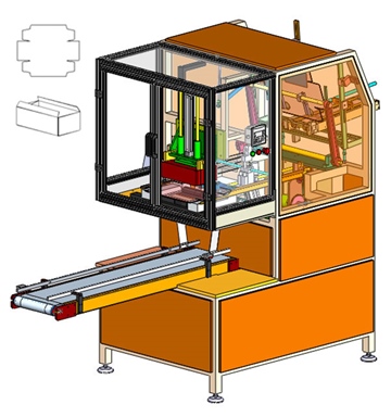 LKK 2003 machine is used for forming boxes by gluing from prepared cardboard blanks. Gluing enables the forming of complex shapes from relatively simple blanks. Installed within the machine is the hot melt glue applicator that controls the amount and the pattern of glue applied onto the blank immediately before box forming. The machine is regulated by a processor and pneumatic elements. LKK 2003 requires a single operator to provide the sufficient amount of blanks in the charger and of glue in the container of the hot melt glue applicator.